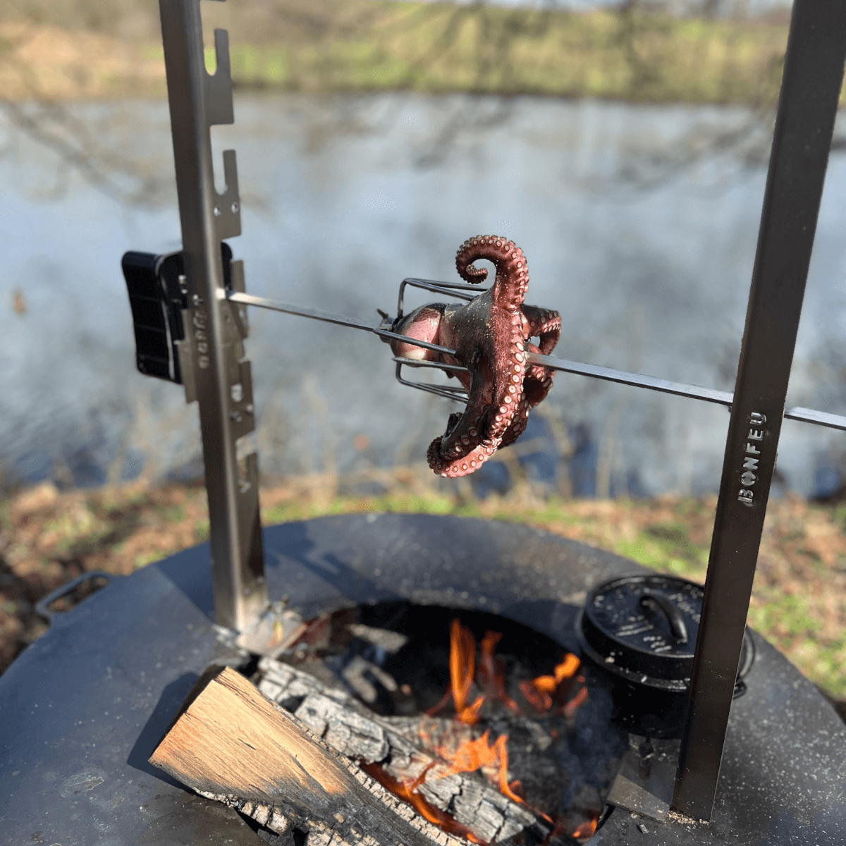 Maak het uzelf makkelijk met de BonFeu motor voor rotisserie set. Installeer de rotisserie set aan de plancha en bevestig de motor op de gewenste hoogte. Bevestig de spies in de motor en zet deze aan. De spies zal rustig worden rondgedraaid en zorgt voor een egaal resultaat boven het vuur.