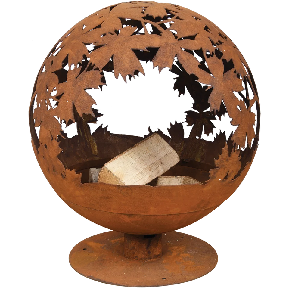 Deze ronde vuurschaal heeft lasergesneden bladeren